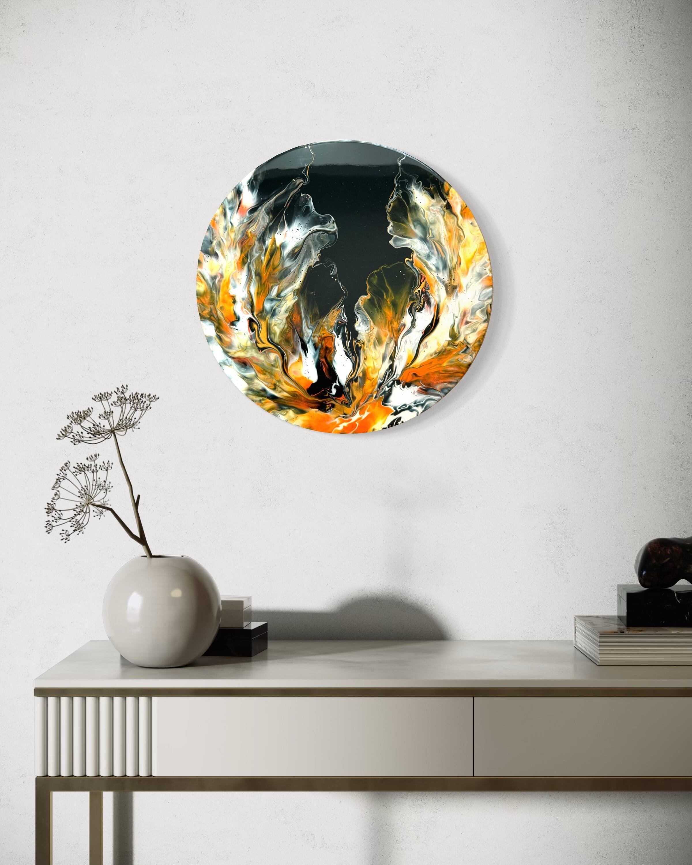 Flame Bloom アート 抽象画 【直径333mm】 木製パネル、レジンコーティング、側面に金箔風加工あり