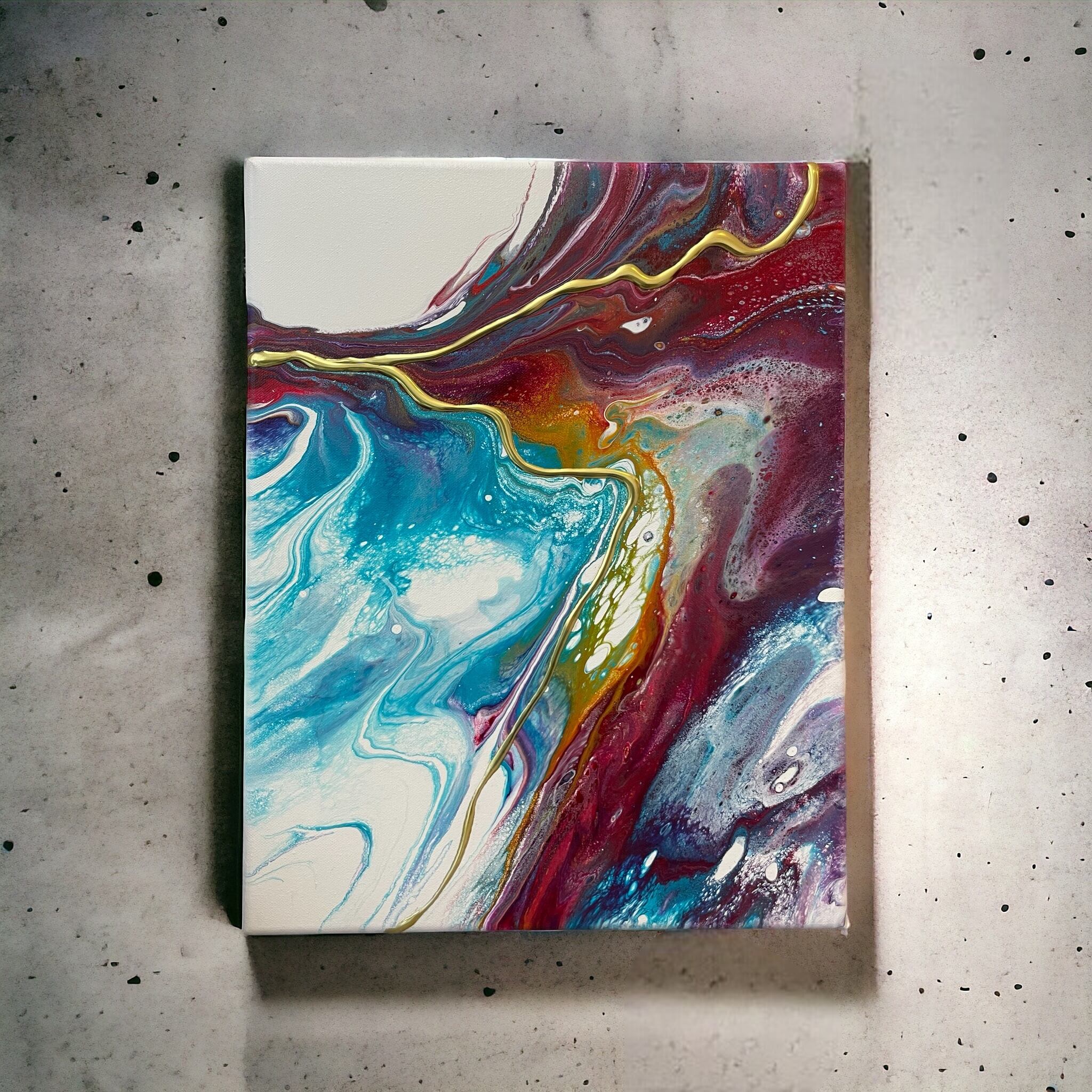 色鮮やかなフルイドアートで波打つ水面を描きました。アクセントにゴールドの立体ラインを引いております。フルイドアート特有のセルが多く出ており、近くで見ていただけるとより楽しめるかと思います。